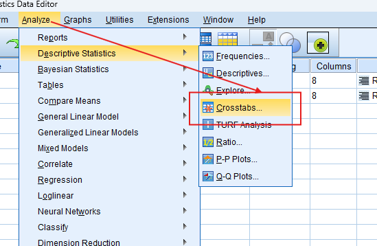- Crosstabs Menüsüne Erişin: Üst menüden Analyze > Descriptive Statistics > Crosstabs yolunu izleyin.